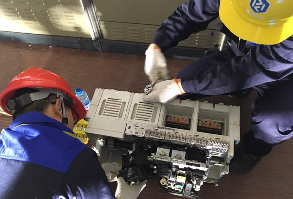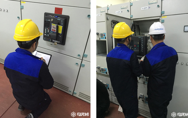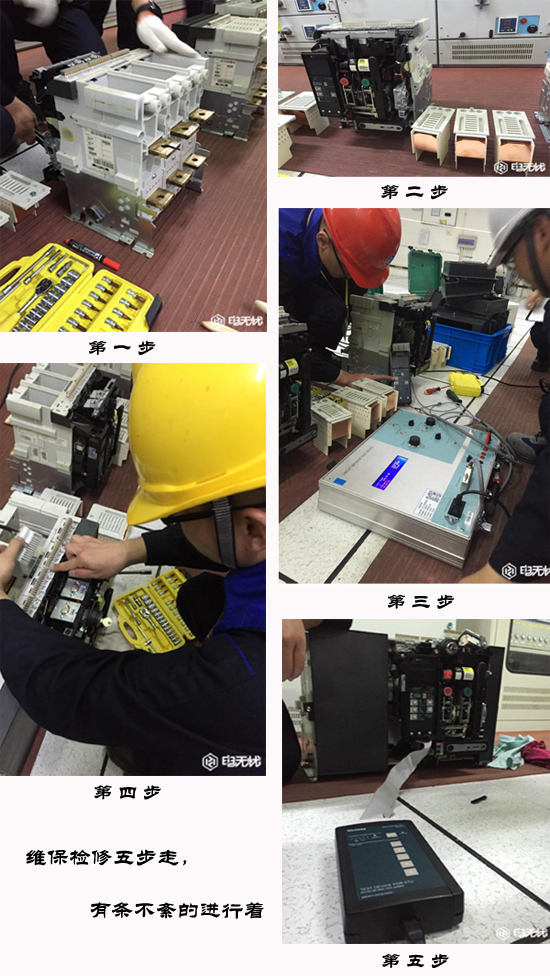 **维保检修第一步:**开关手动操作测试,清脆的开关声音此起彼伏,宛如一出交响乐,用心去聆听,那是一切正常的声音。 **维保检修第二步:**灭弧罩清洁,灭弧室清洁。灭弧片重新焕发出崭新的闪光。 **维保检修第三步:**利用专业仪器对保护单元进行试验。专人记录,确保测量数据的准确性。 **维保检修第四步:**因为二次回路没有电,只有利用临时制作的航空插对断路器进行电气试验。电无忧团队真是人才济济! **维保检修第五步:**利用手持式测试仪对保护单元进行自检。