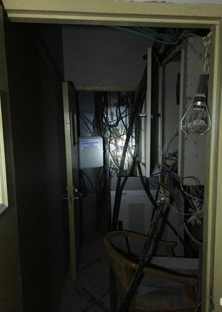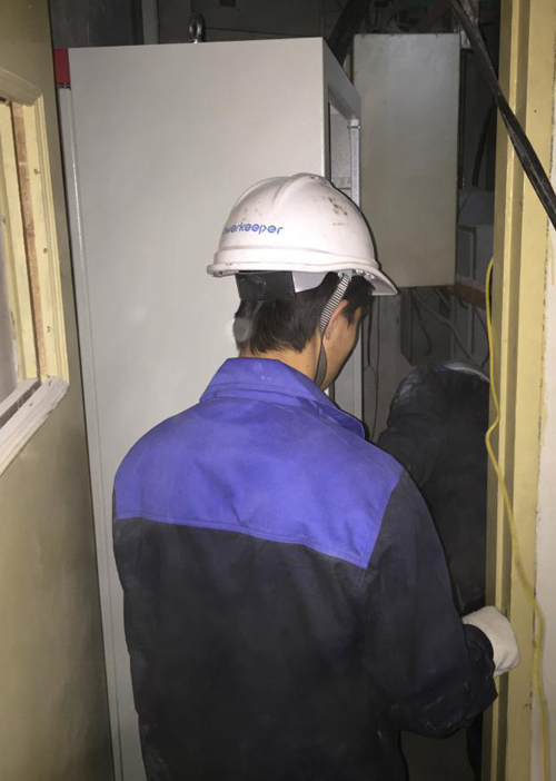 经过一番周折,柜子终于到达配电间的门口,但所有人被眼前的景象惊呆了!因为该楼层在整体装修,配电间堆满了粉尘,排线走线十分凌乱,空间也很小,仅能容许两人并排通过。 还没开始施工,就遇到了不小的困难。柜子需要进入配电间,而能放置柜子的地方被废弃的动力柜占据了,这么窄的空间,动力柜只能推着进出,地上的建筑垃圾对进出有影响。经过与物业的沟通,由物业方打扫现场并拆掉墙体上的动力柜。
