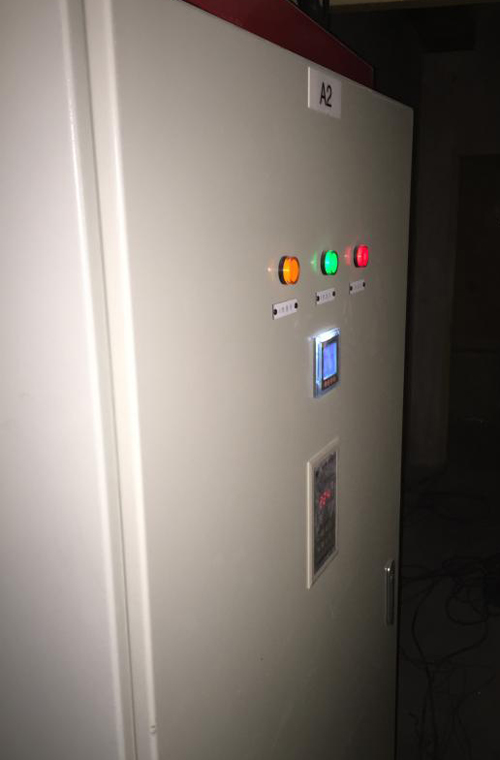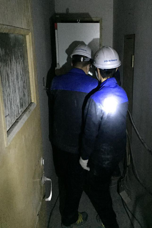 清扫终于完成,先将柜子移进配电间。由于空间太小,动力柜进配电间也经过了一番周折。整座楼层都没有照明,只能借助手电筒的灯光。